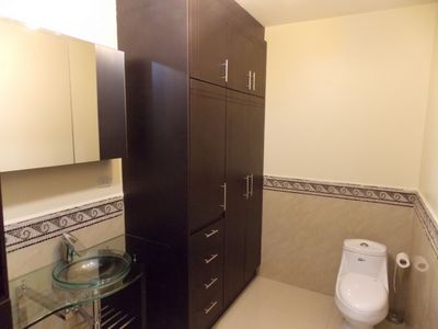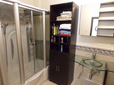 The master bath is equipped with a jacuzzi shower cabin and storage closets.