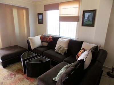 The living room is equipped with AC, overhead fans, comfortable 6-piece sectional, custom window coverings, and a 36-inch Vizio HDTV.
